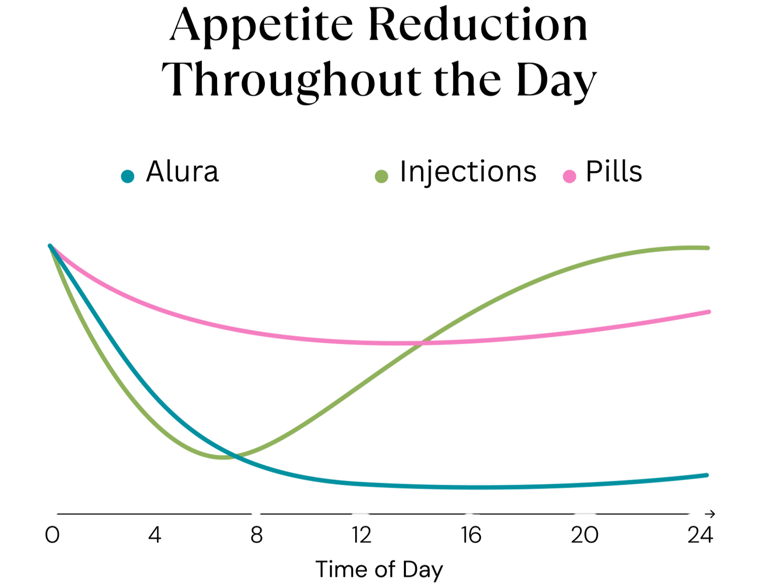 This graph illustrates how Alura Patches, injections, and pills differ in appetite-control performance over a 24-hour period.