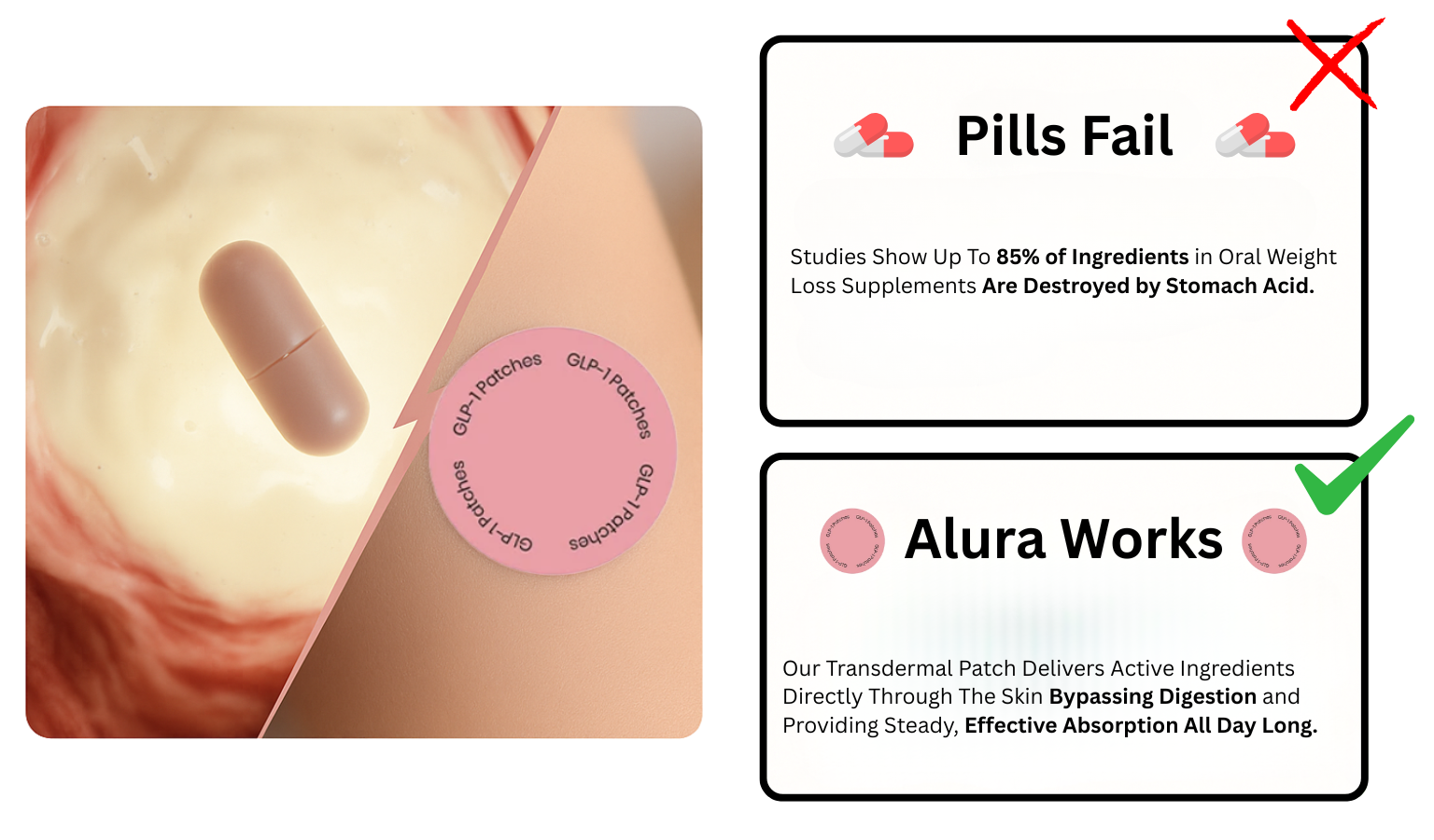 Beneath its simplicity lies advanced transdermal science. Alura Patches deliver nutrients directly through the skin into the bloodstream, ensuring faster, more efficient absorption. That means ❌ no digestive loss, ❌ no reduced potency, and ❌ no need for high doses. Each patch provides steady, time-released support with ingredients optimized for skin absorption.